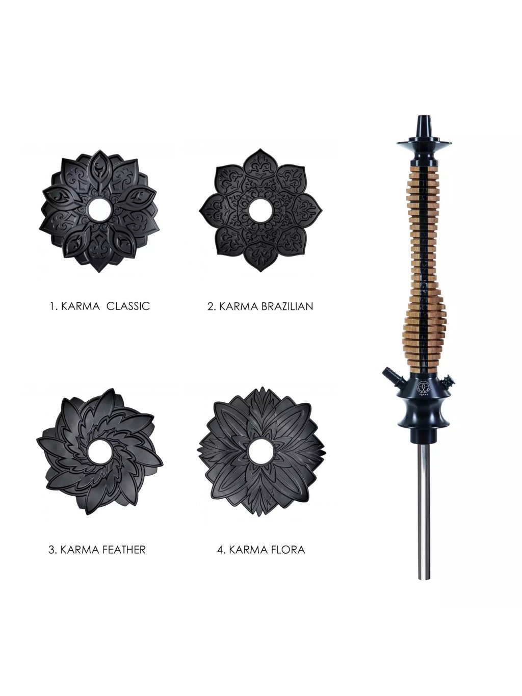 Vodní dýmka Karma je složena z různých materiálů. Její srdce je z odolného polyacetalu, vrchní část těla a talířek jsou vyrobeny z anodizovaného hliníku, downstem je vyroben z nerezové oceli a tělo má dřevěný obal. Tuto dýmku lze kompletně rozebrat a každou část důkladně vyčistit. Dýmka nabízí velmi příjemný a lehký tah.