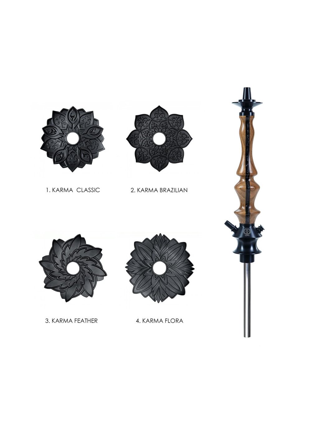 Vodní dýmka Karma je složena z různých materiálů. Její srdce je z odolného polyacetalu, vrchní část těla a talířek jsou vyrobeny z anodizovaného hliníku, downstem je vyroben z nerezové oceli a tělo má dřevěný obal. Tuto dýmku lze kompletně rozebrat a každou část důkladně vyčistit. Dýmka nabízí velmi příjemný a lehký tah.